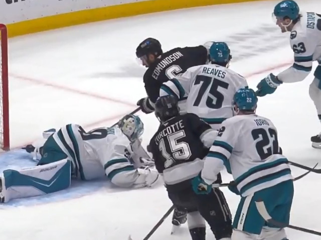 Los Angeles Kings defenceman Joel Edmundson loses a go-ahead goal after video review confirms the call on the ice that the puck was pushed into the net with his glove late in the third period against the San Jose Sharks.