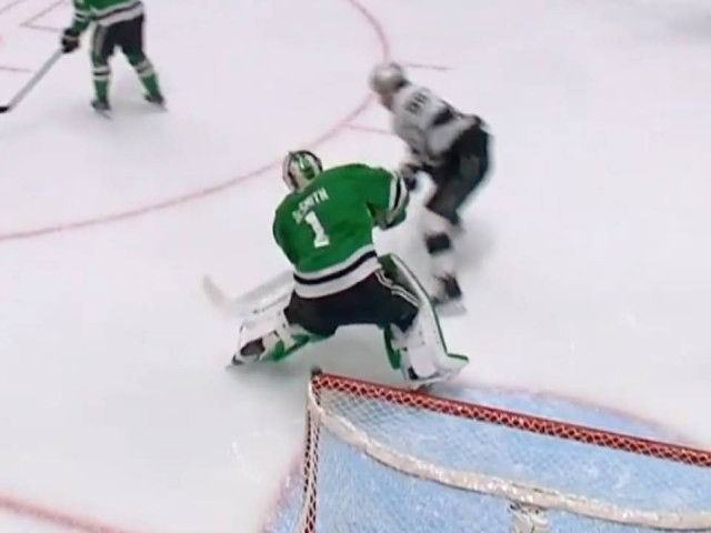 Watch as Los Angeles Kings forward Andrei Kuzmenko pounces on Dallas Stars goaltender Casey DeSmith while he’s playing the puck, stealing it and sliding it underneath his pads for a costly misplay.