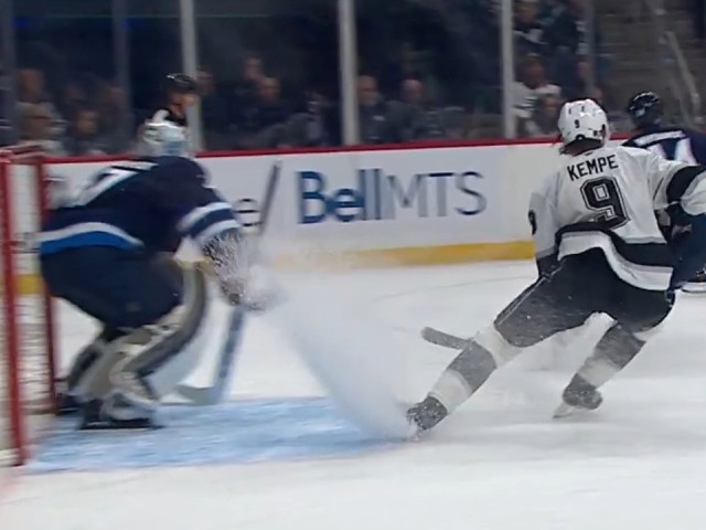 Los Angeles Kings forward Adrian Kempe scores off a nifty passing play from teammates Anze Kopitar and Andrei Kuzmenko to take the lead midway through the second period against the Winnipeg Jets.
